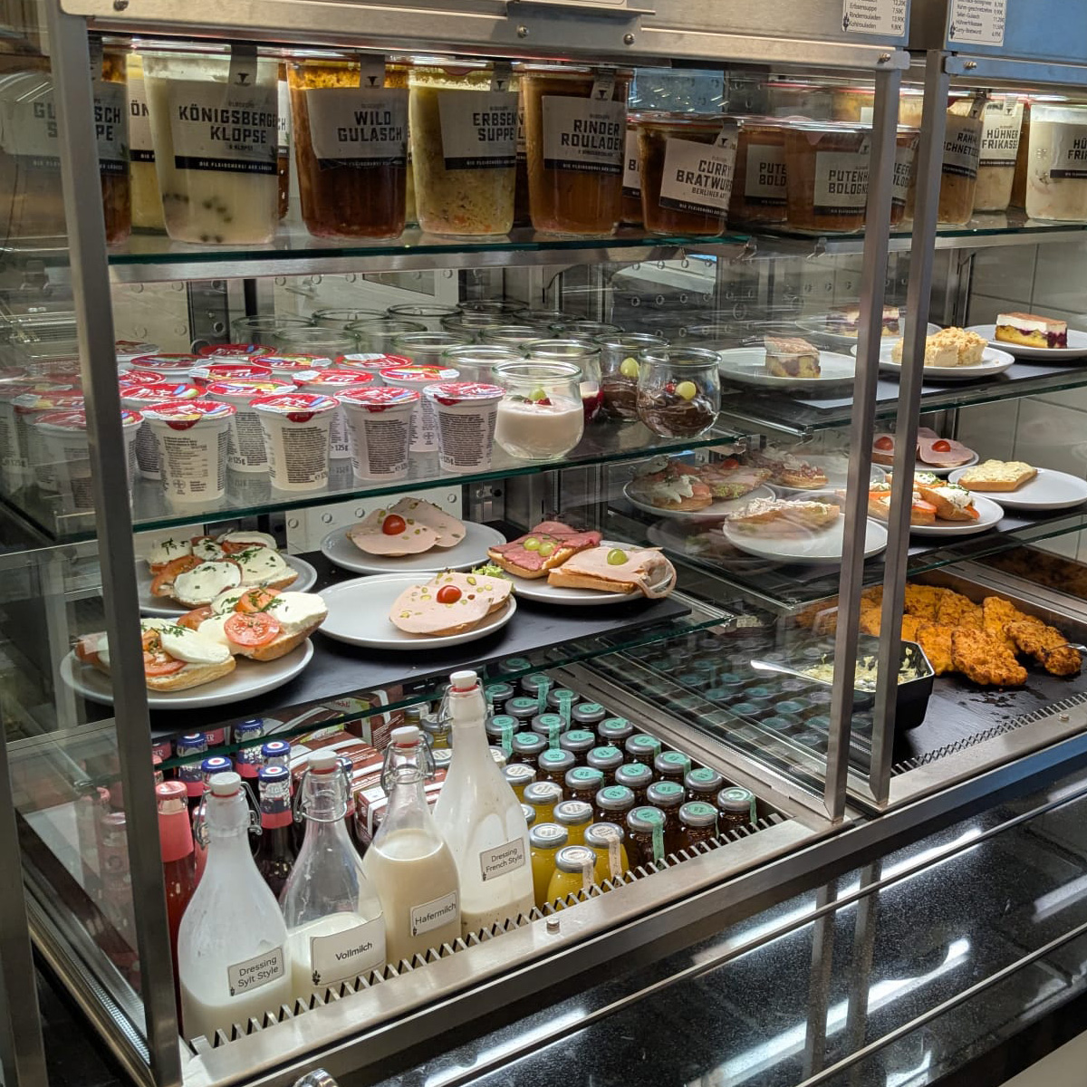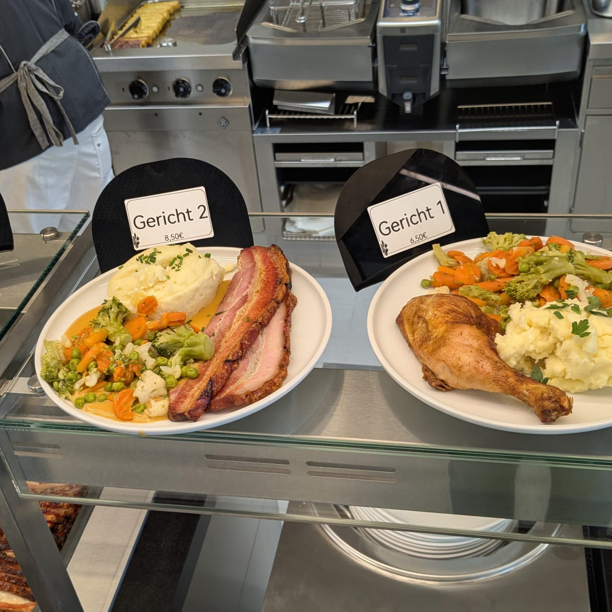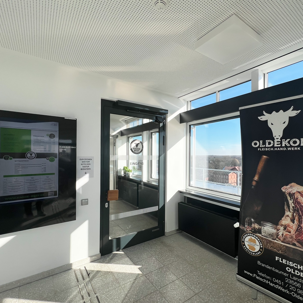 Die Gastronomie von Hanse‑Beef befindet sich im siebten Obergeschoss des Lübecker Landgerichts und ist mehr als eine gewöhnliche Kantine. Gäste gelangen durch die Einlasskontrolle und genießen dann bodenständige Gerichte, die täglich wechseln. Drei unterschiedliche Menüs – eines davon fleischlos – sorgen für Abwechslung und zeigen, dass auch traditionelle Küche vegetarische Optionen umfasst.